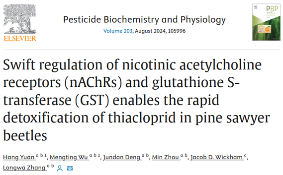 我室张龙娃教授课题组在《Pesticide Biochemistry and Physiology》(IF=4.7,中科院一区)发表在重大林业害虫松墨天牛对噻虫嗪解毒机制方面的最新研究论文,题目为“Swift regulation of nicotinic acetylcholine receptors (nAChRs) and glutathione S-transferase (GST) enables the rapid detoxification of thiacloprid in pine sawyer beetles”。