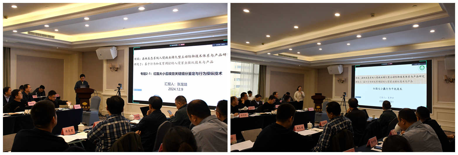 “森林生态系统入侵病虫持久型主动防御技术体系与产品研究”项目执行期2023年11月-2026年10月。项目旨在围绕森林入侵病虫防控的国家重大需求,以我国成功定殖、存在持续扩散和危害加重风险的五针松疱锈病、桉树青枯病、红脂大小蠹和柚木驼蛾等4种重要森林入侵病虫为对象,基于入侵病虫关键生物学特性,发掘成灾过程的新型防控靶点,探索和建立协调利用有益生物等自然因子的防控技术,融合现代生物技术,丰富经典防治理论与技术。研发信息操纵、生物调控等精准和持久控害的技术及其产品,推动森林入侵病虫高效防控。构建应急根除与持久型主动防御技术体系,实现对森林入侵生物扩散的有效控制。本室张龙娃教授课题组主持项目专题“基于行为和发育调控的入侵害虫操纵技术与产品”,会上张龙娃教授和吴梦婷副教授分别做项目进展汇报。